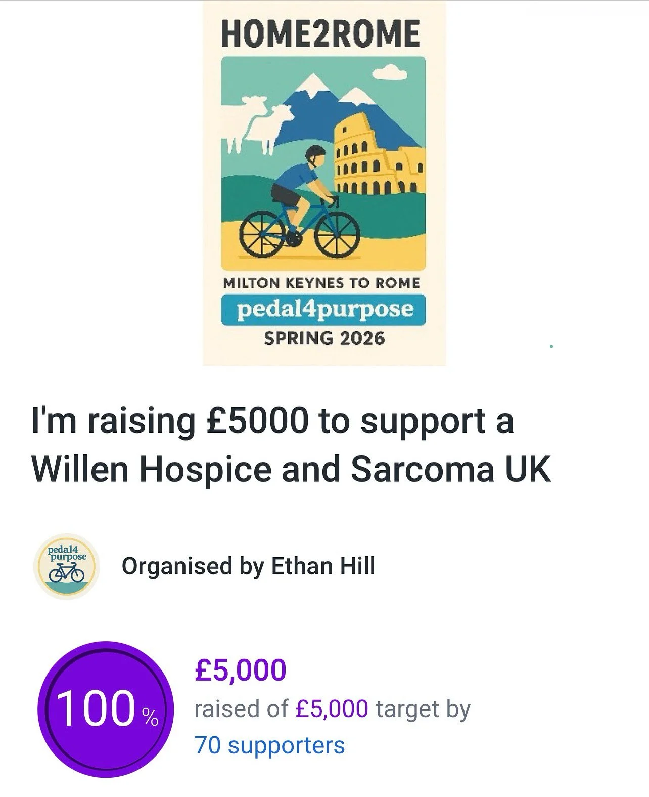A massive thank you to everyone who’s donated, shared, and supported us. Your kindness and generosity are powering this journey. Every single pound will be split evenly between Willen Hospice and Sarcoma UK, making a real difference.